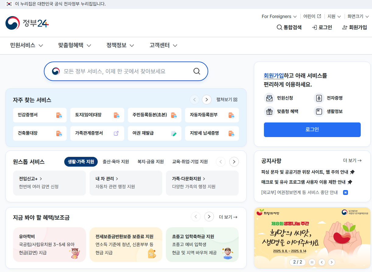 - 정부 24, 복지로, 지자체 홈페이지에서 본인 인증 후 신청 가능